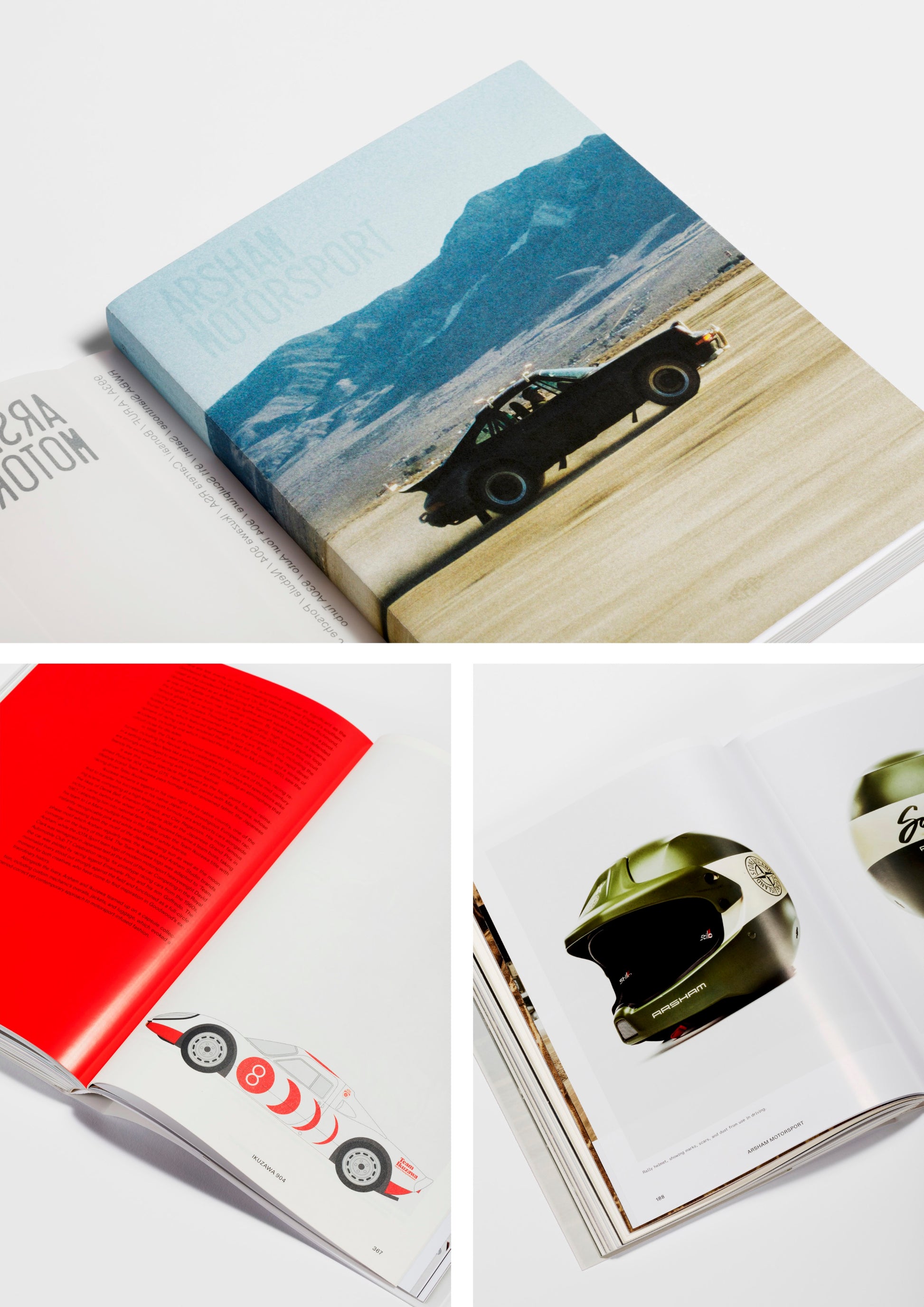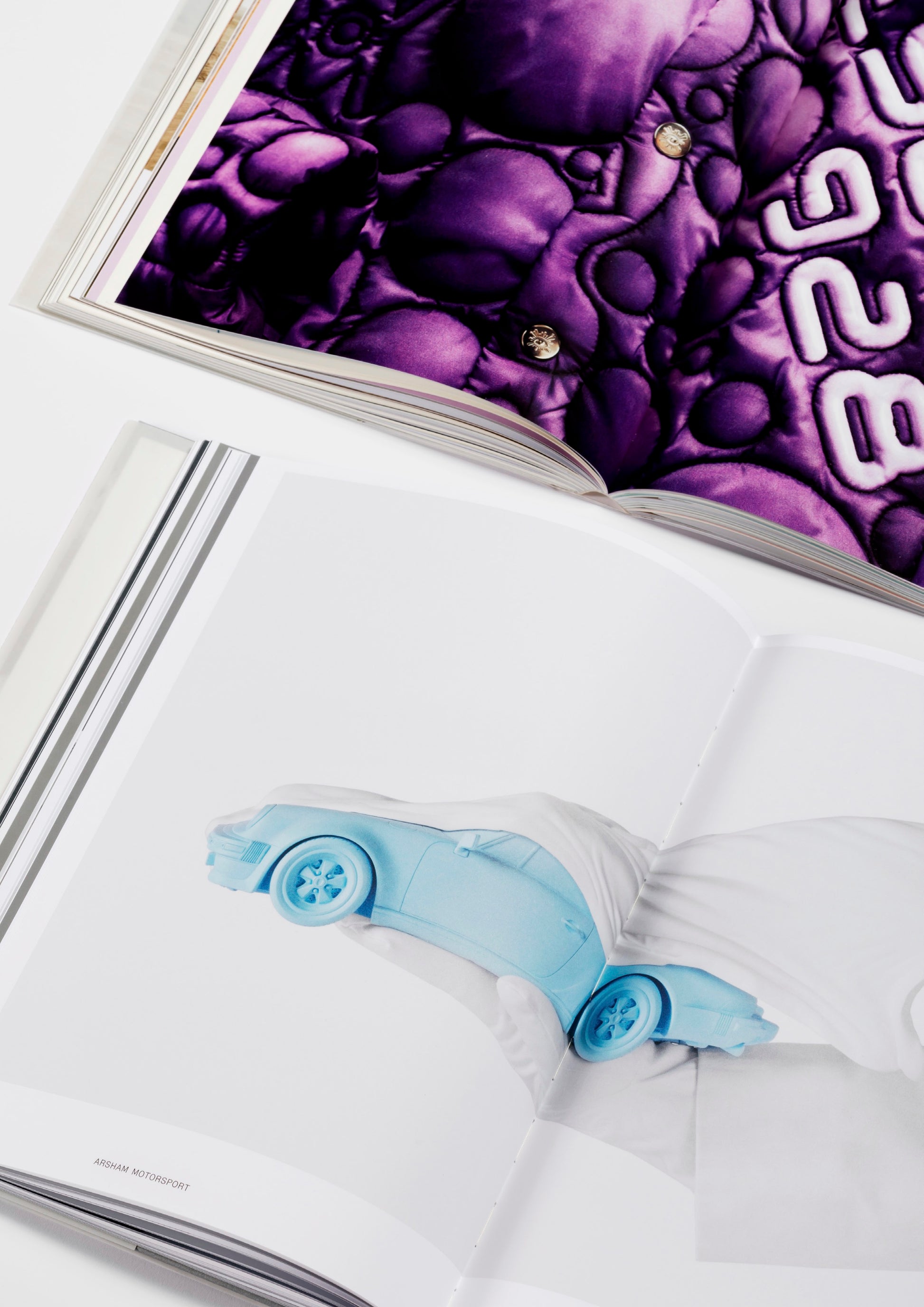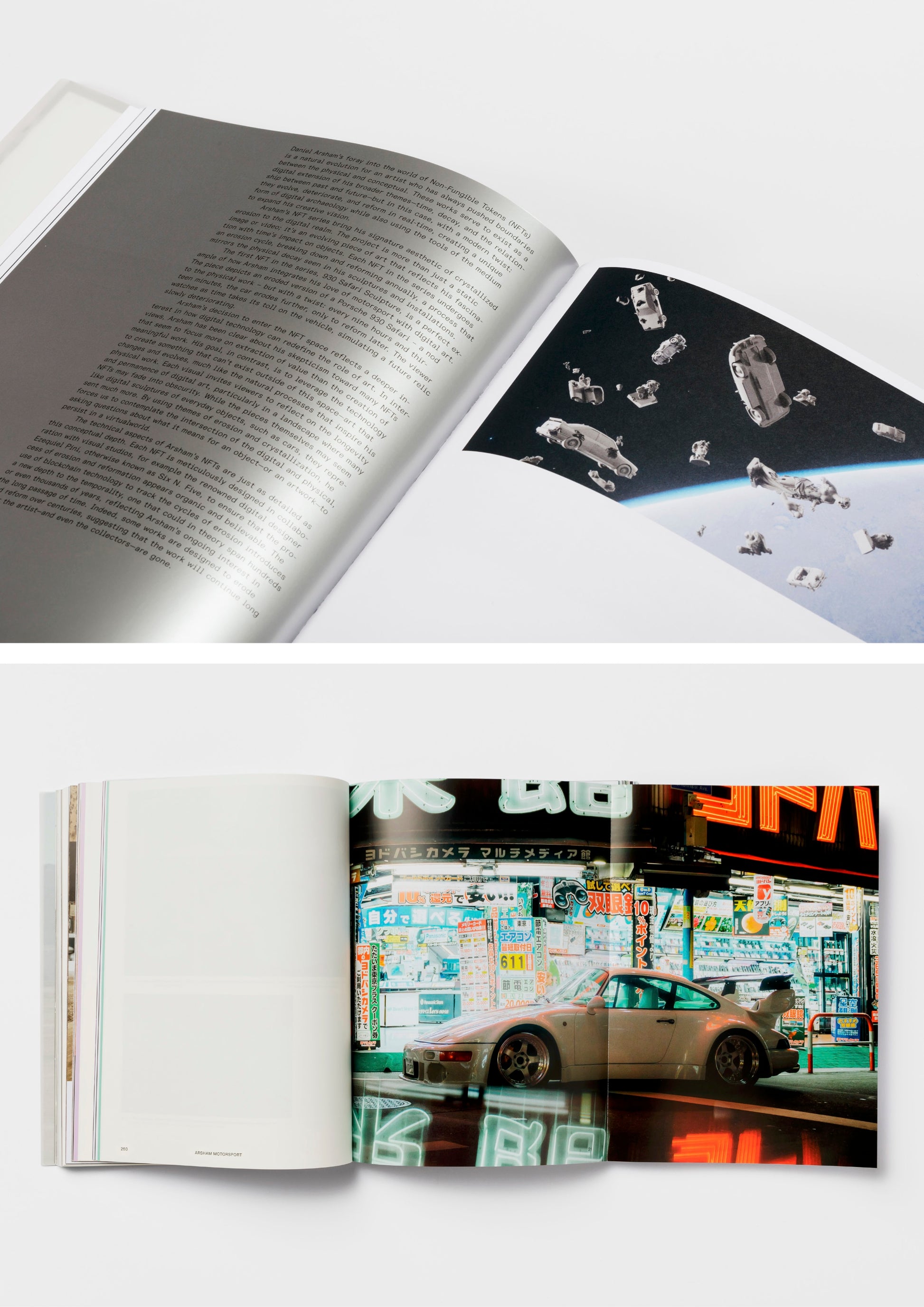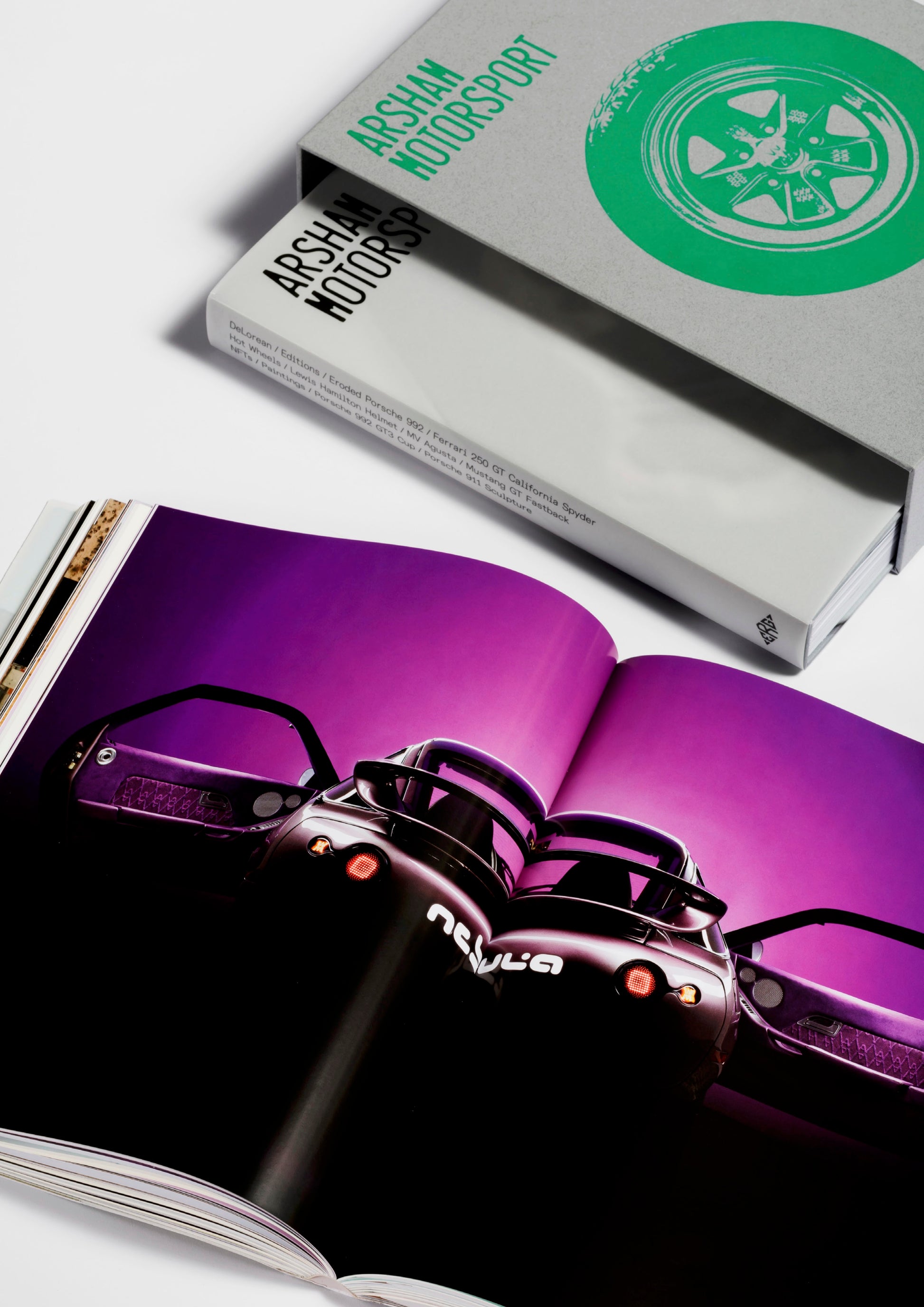 Arsham Motorsport is presented as two distinct volumes contained within a collectible slipcase, each featuring a deep exploration of Arsham's portfolio, respectively focusing on the expansive series of bespoke automobiles created by the artist alongside his collaborative network, and on his uchronic, instantly recognisable “Eroded” artworks.